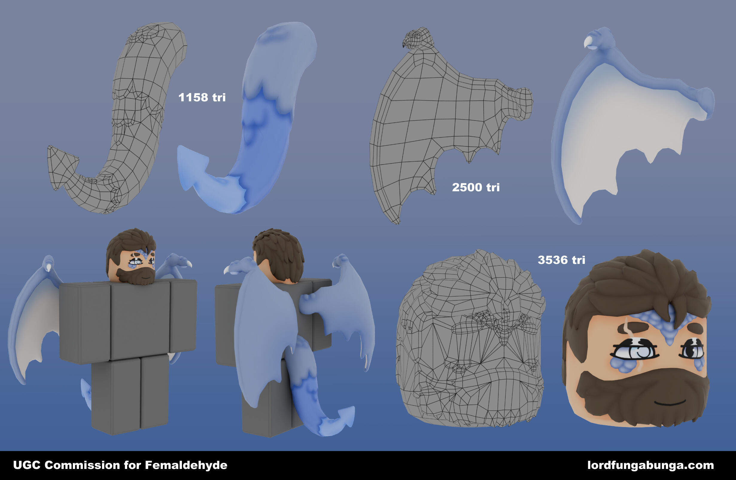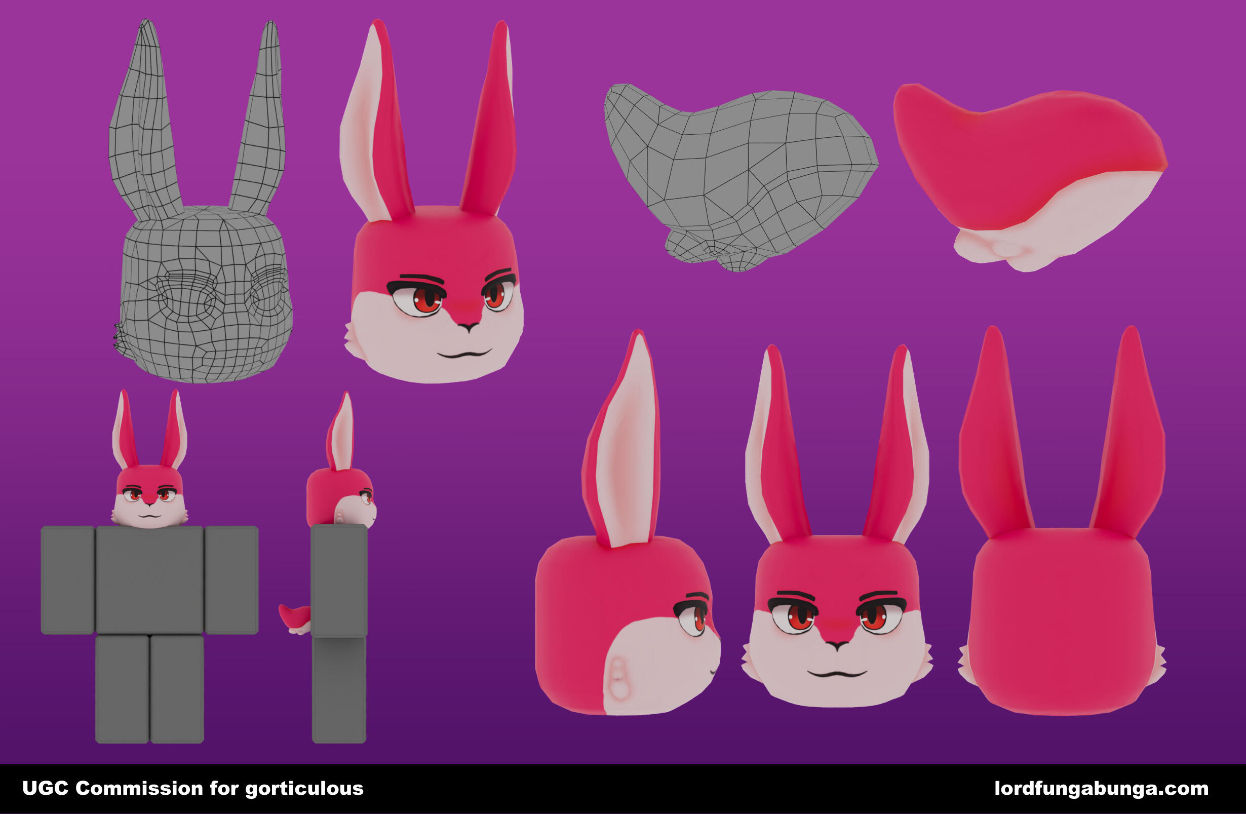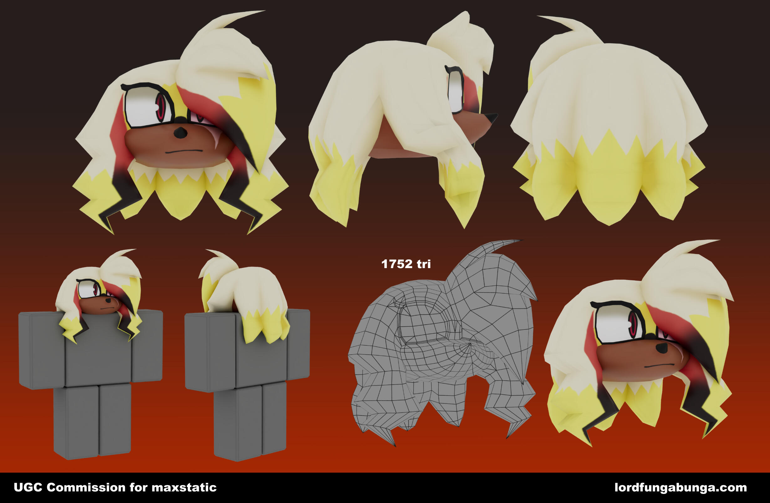 Edits cannot be made after publishing to Roblox. Many screenshots will be sent before I publish. Any errors not on my end will be a optional $20 reupload fee for fixes.The whole item will be made from scratch by me, including any 2d drawings that may need to be made for the texture.Buyer can also choose what they want the item name and description to be, all I will be adding is "Commission for <username>".Currently doing slots through google forms, fill it out or contact me on Discord @lordfungabunga.