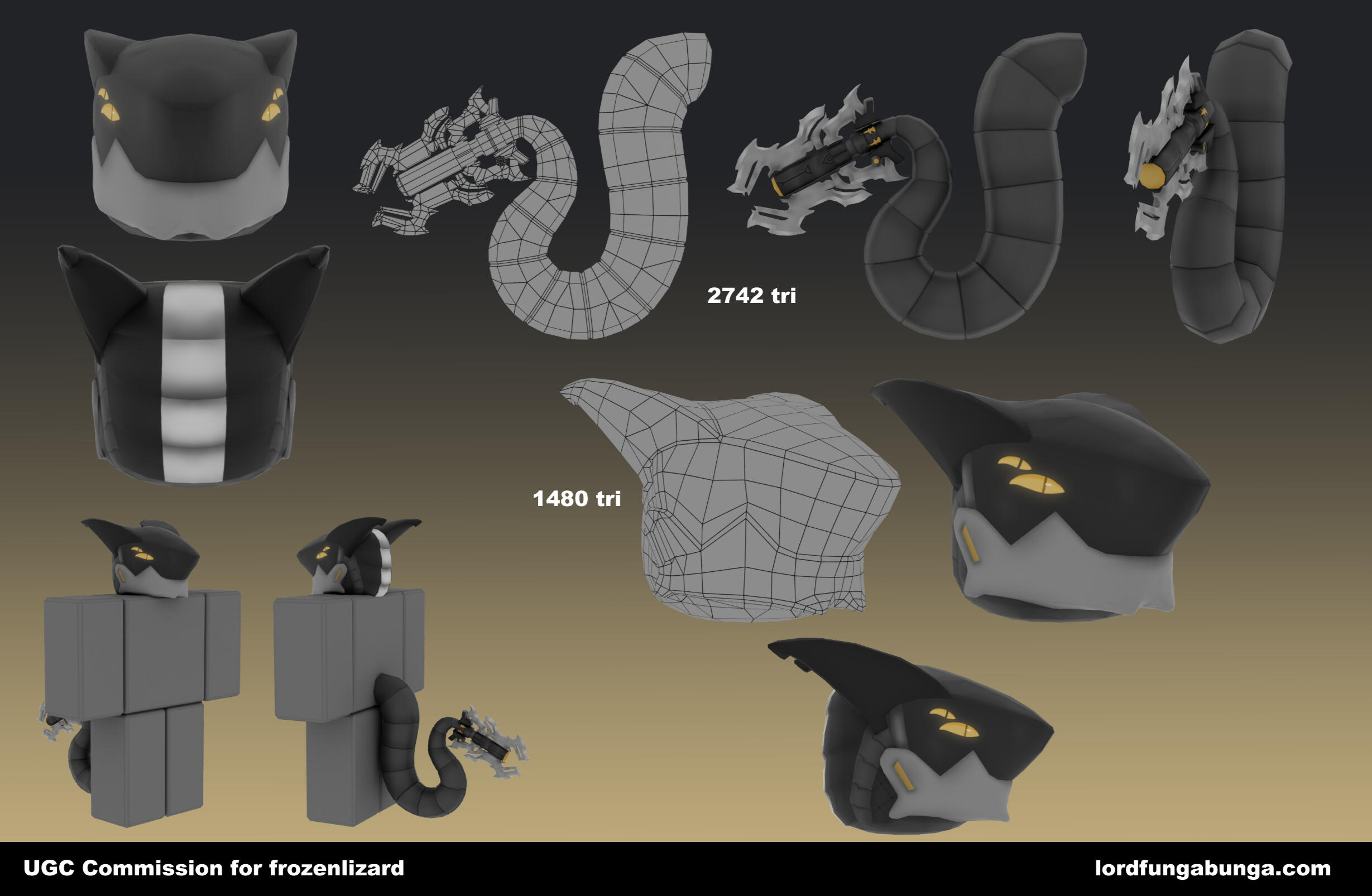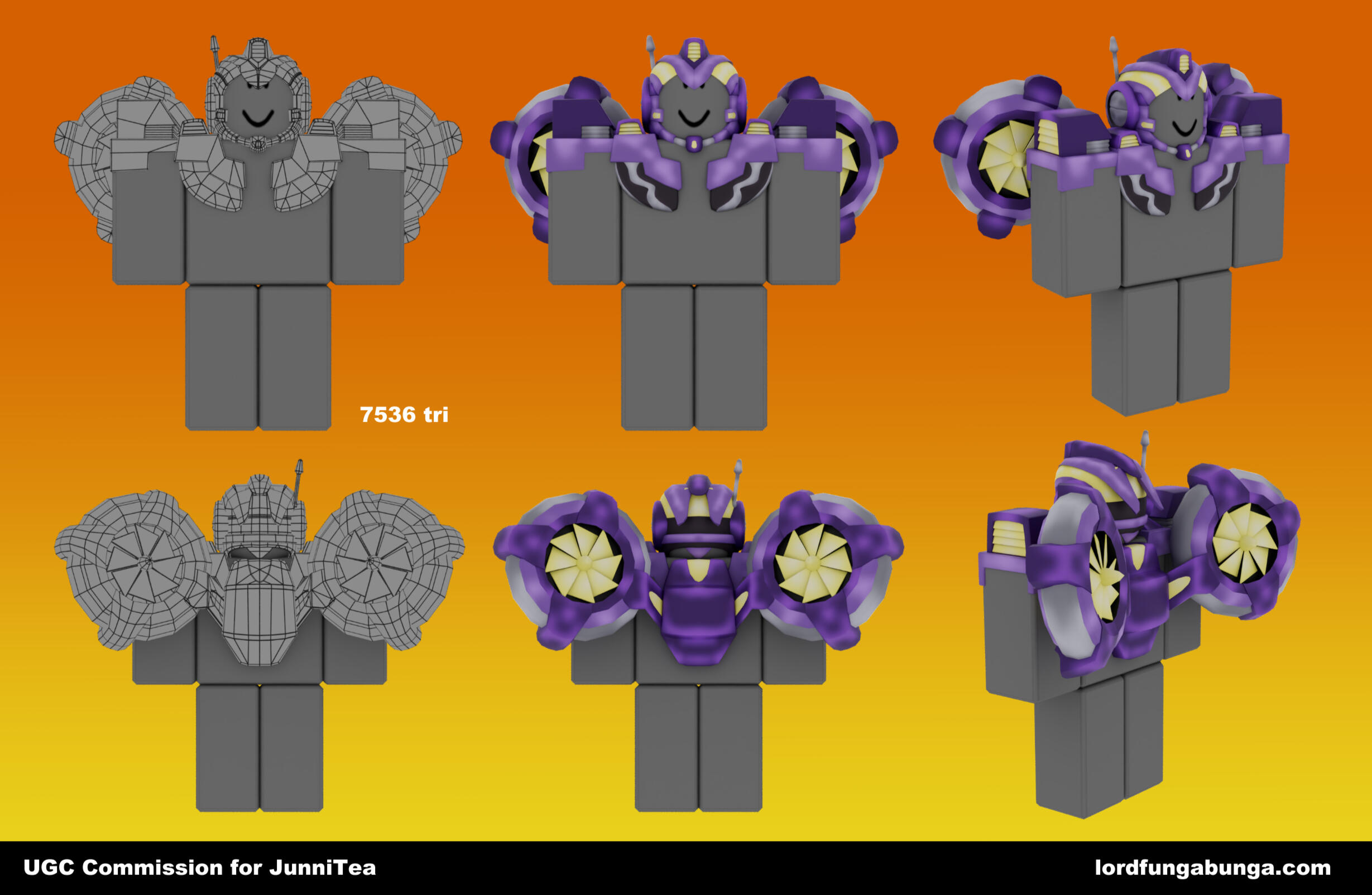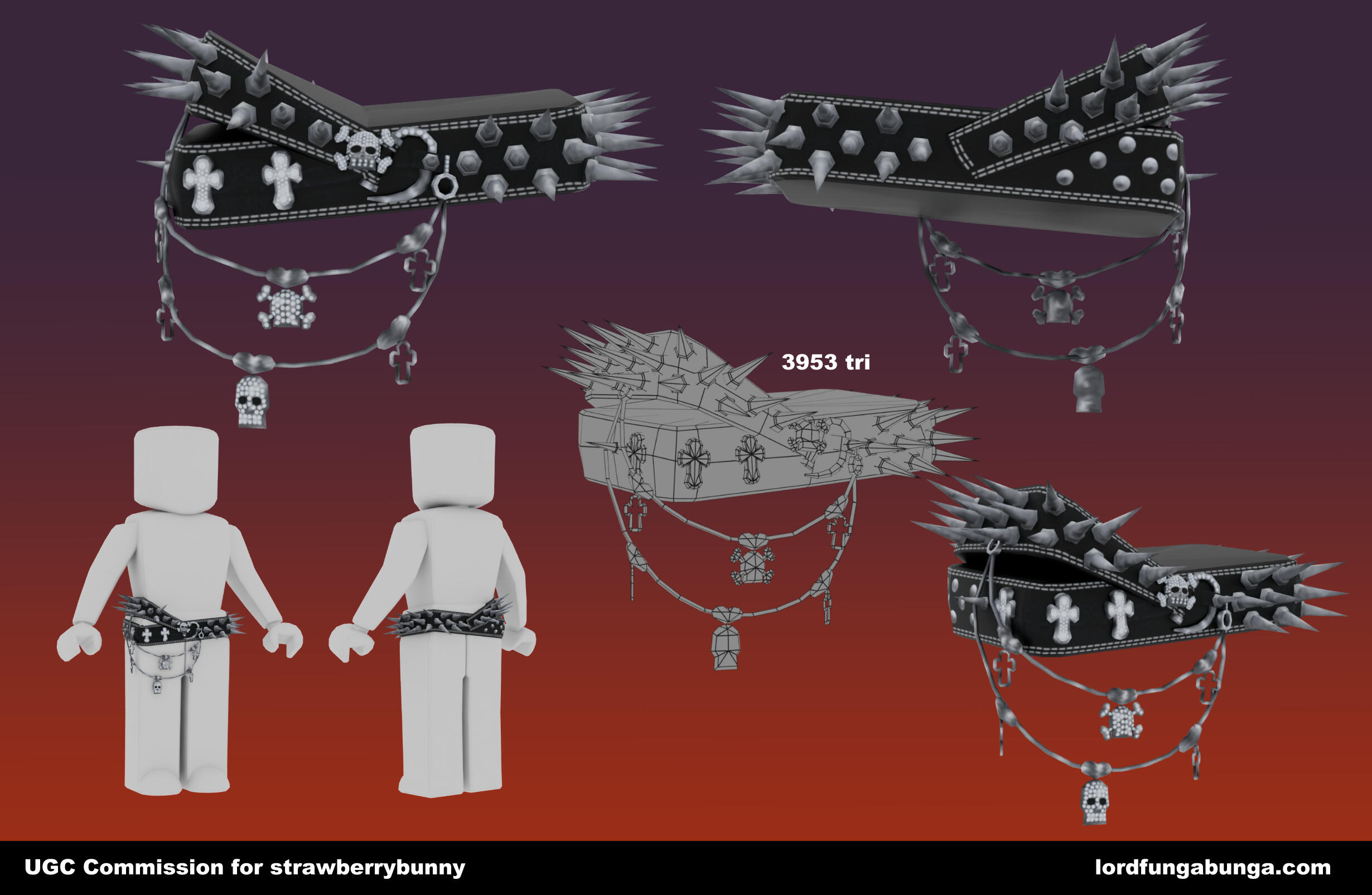Edits cannot be made after publishing to Roblox. Many screenshots will be sent before I publish. Any errors not on my end will be a optional $20 reupload fee for fixes.The whole item will be made from scratch by me, including any 2d drawings that may need to be made for the texture.Buyer can also choose what they want the item name and description to be, all I will be adding is "Commission for <username>".Currently doing slots through google forms, fill it out or contact me on Discord @lordfungabunga.